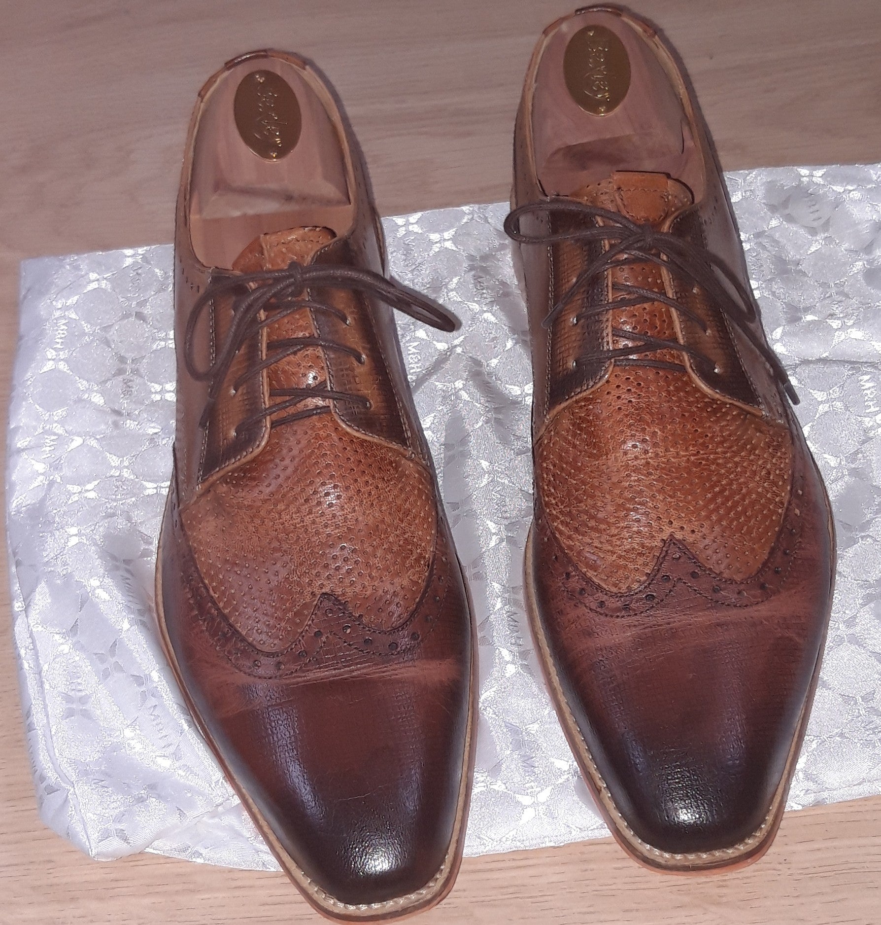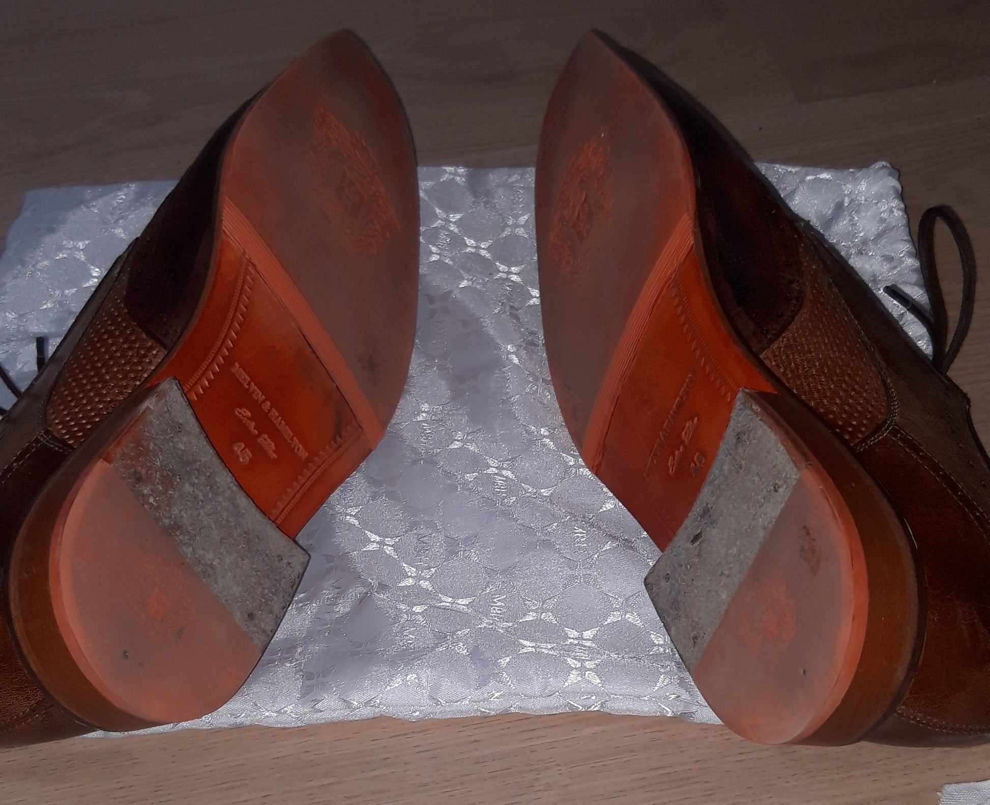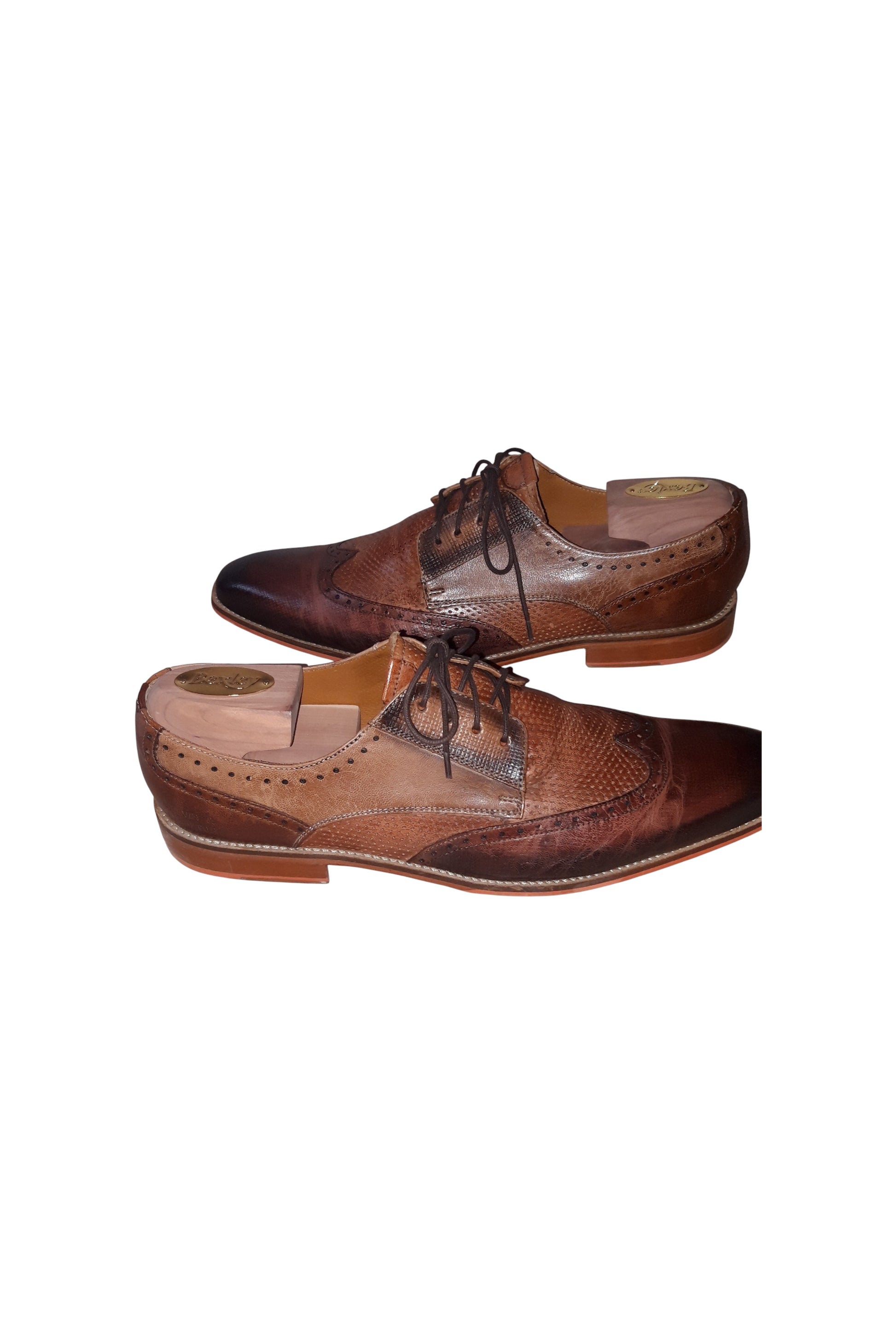 LEONARDO - Derby shoes - beige Size: 45 Information: -Toe: Square -Heel shape: Block -Fastening: Lacing -Upper: Leather -Lining: Leather -Insole: Leather -Outsole: Synthetic material / leather -Lining thickness: Lining protecting from the cold -Heel height: Low -Worn less than 20 times -Purchased in 2023 -> Excellent condition - perfect care: no exposure to light, heat or humidity - Stored in its dust bag with shoe trees. -> Sold without packaging, without shoe trees and without the original M&H box Price: €75