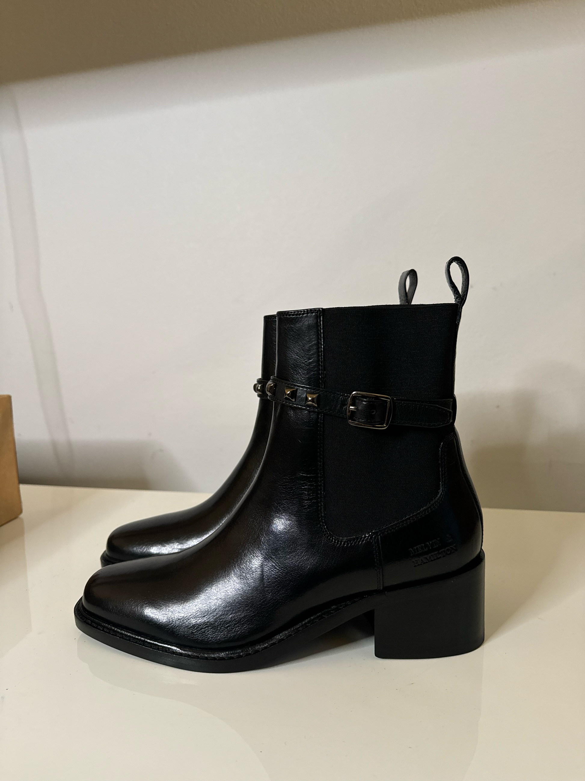 Melvin & Hamilton présente sa collection automne/hiver de bottines Chelsea pour femme. Incontournables en hiver pour leur confort et leur côté pratique, ces bottines à élastique sur le côté sont la spécialité de la marque. Voici les caractéristiques de notre modèle en cuir Hadley 4. Osez l'originalité avec cette paire de Chelsea boots à talon bottier en cuir de vachette noir ! Avec leur semelle en cuir & gomme noir, ces bottines à bout carré complèteront parfaitement une tenue sobre hivernale aussi bien qu'un look coloré. Toutes les touches de couleurs sont les bienvenues pendant la saison froide. Et si en plus elles sont fabriquées en cuir de qualité avec tout le savoir-faire de Melvin & Hamilton, vous faites le bon choix !